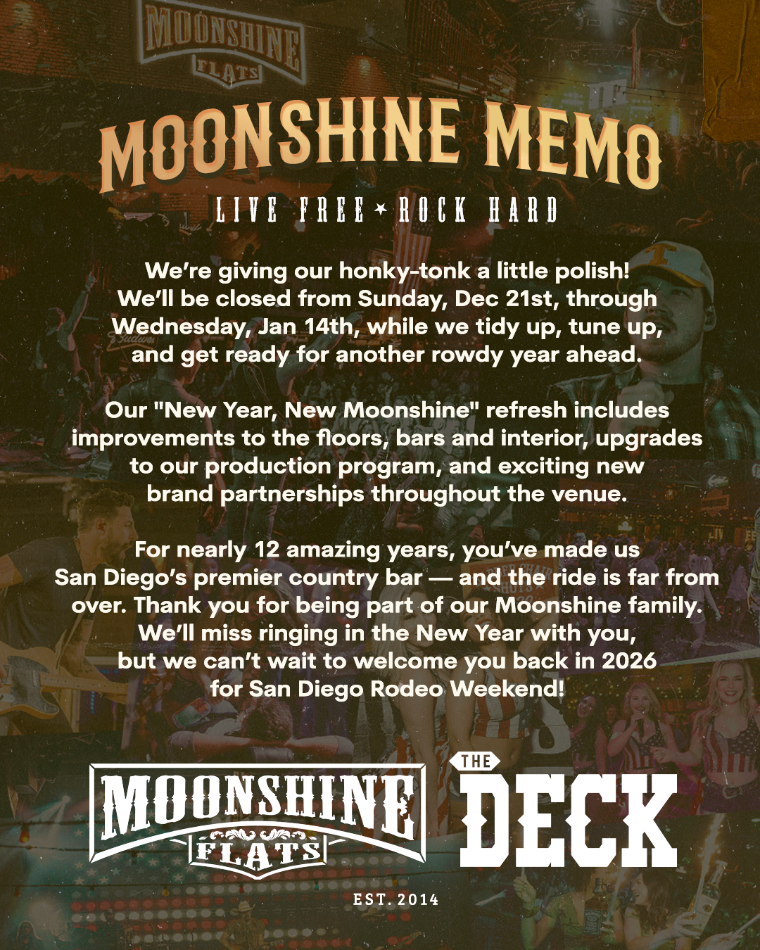 We're giving our honky tonk a little polish! Moonshine Flats will be closed from 12/21/25 through 1/14/26 to renovate the venue. We'll miss ringing in the new year with our Moonshine family but we can't wait to welcome you back in 2026!