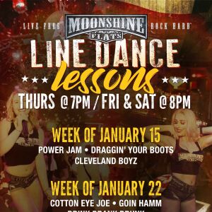 26 | 27 | 28 | 29 ![]() Line Dance Lessons at Moonshine FlatsThu, Jan 29![]() INFO Kick off your weekend early with Line Dancing Lessons and drink specials all night long!JACK'D UP THURSDAYS Doors Open @ 7PMLine Dancing Lessons: 8:30PM – 10PMDJ & Dancing: 10PM –... VIEW FULL SIZE FLYER | 30 ![]() Ash Easton at Moonshine FlatsFri, Jan 30![]() INFO GUEST LIST INFO:Doors Open @ 7pmGuest List Sign-Up Ends @ 6pm or when Guest List is fullGuest List Closes @ 10pm. Must Arrive before 10pm for Guest List Consideration!NIGHTLY SCHEDULE:Dive Bar Happy... VIEW FULL SIZE FLYER | 31 |
