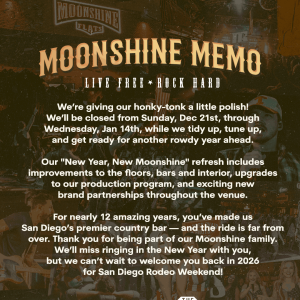 12 | 13 | 14 ![]() CLOSED - Moonshine Flats & The DeckWed, Jan 14![]() INFO Hi Moonshine fam!Moonshine Flats and The Deck will be temporarily closed from Sunday, 12/21 through Wednesday, 1/14/2026 for rennovations. See you back on Thursday, 1/15/2026. Miss you already! VIEW FULL SIZE FLYER | 15 ![]() Line Dance Lessons at Moonshine FlatsThu, Jan 15![]() INFO Kick off your weekend early with Line Dancing Lessons and drink specials all night long!JACK'D UP THURSDAYS Doors Open @ 7PMLine Dancing Lessons: 8:30PM – 10PMDJ & Dancing: 10PM –... VIEW FULL SIZE FLYER | 16 ![]() Daniel Bonte at Moonshine FlatsFri, Jan 16![]() INFO GUEST LIST INFO:Doors Open @ 7pmGuest List Sign-Up Ends @ 6pm or when Guest List is fullGuest List Closes @ 10pm. Must Arrive before 10pm for Guest List Consideration!NIGHTLY SCHEDULE:Dive Bar Happy... VIEW FULL SIZE FLYER | 17 ![]() Daniel Bonte at Moonshine FlatsSat, Jan 17![]() INFO GUEST LIST INFO:Doors Open @ 7pmGuest List Sign-Up Ends @ 6pm or when Guest List is fullGuest List Closes @ 10pm. Must Arrive before 10pm for Guest List Consideration!NIGHTLY SCHEDULE:Dive Bar Happy... VIEW FULL SIZE FLYER | |